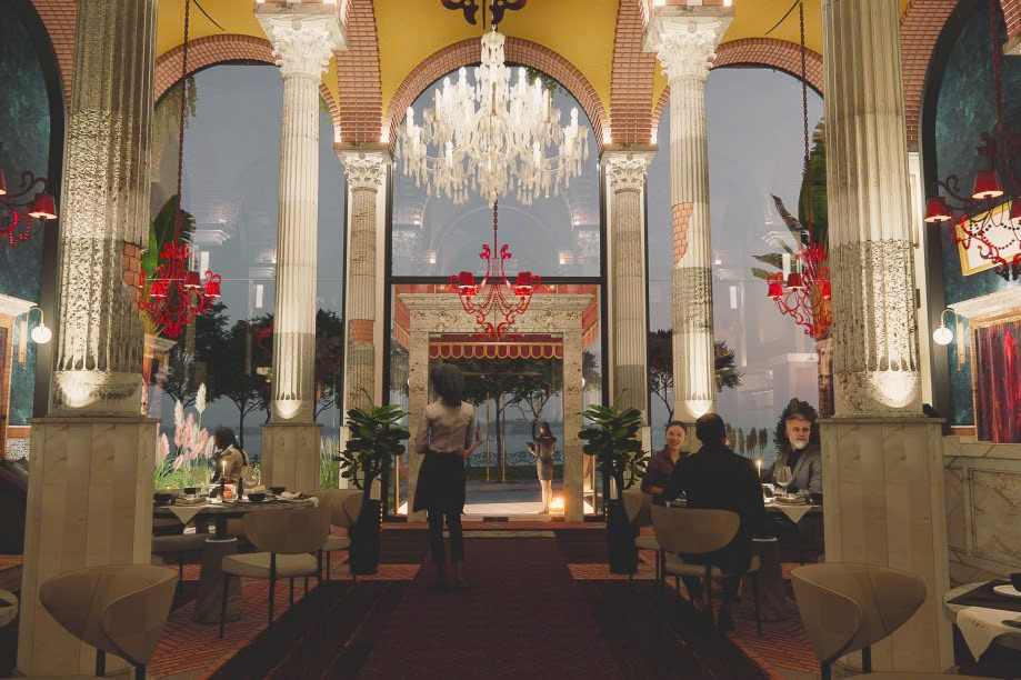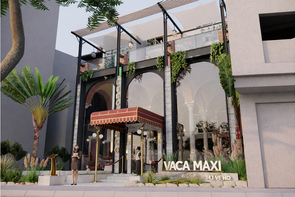 Không gian VACA MAXI được lấy cảm hứng từ những steakhouse châu Âu, với thiết kế vòm cao, tỷ lệ kiến trúc cân đối và ánh sáng vàng ấm. Các vật liệu như đá, gỗ sẫm màu và kim loại được lựa chọn có chủ đích, tạo nên một tổng thể sang trọng, ấm cúng và giàu chiều sâu cảm xúc.